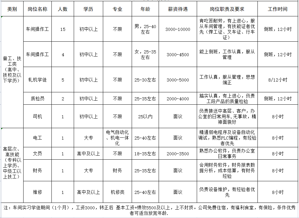 企业简介 公司2009年成立,位于河北省邢台市经济开发区沙河城镇东赵庄村南(原沙河市沙河城镇东赵庄村南),占地60余亩,注册资金1000万。现有员工120人,其中高管15人,高级技工15人,新产品研发人员4人。年产能:可加工各种不锈钢带、不锈钢板2万余吨;加工不锈钢钢中底500万余双;加工各种不锈钢紧固件2000万余件。经几年的不懈努力,公司已成为一家业务专精、资源汇聚的优秀民企。 招聘岗位 联系人:石志英 联系电话:18531799777 企业邮箱:274354975@QQ.com 企业地址:邢台市经济开发区沙河城镇东赵庄村南